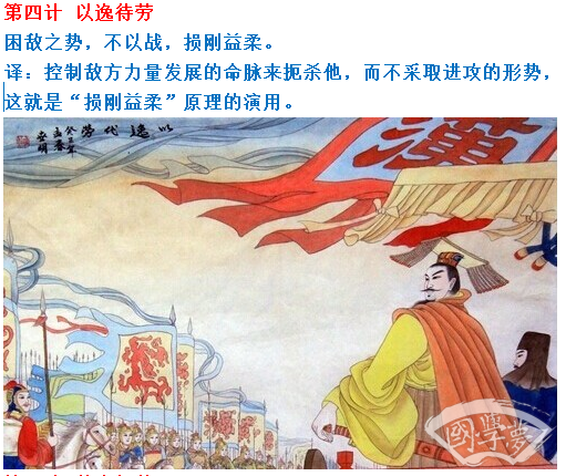 ②损刚益柔:语出《易经. 损》。“刚”、“柔”是两个相对的事物现象,在 一定的条件下相对的两方有可相互转化。“损”,卦名。本卦为异卦相叠(兑下艮 上)。上卦为艮,艮为山,下卦为兑,兑为泽。上山下泽,意为大泽浸蚀山根之象, 也就说有水浸润着山,抑损着山,故卦名叫损”。“损刚益柔”是根据此卦象讲述 “刚柔相推, 而主变化” 的普遍道理和法则。此计正是根据“损”卦的道理,以 “刚”喻敌,以“柔”喻已,意谓困敌可用积极防御,逐渐消耗敌人的有生力量, 使之由强变弱,而我因势利导又可使自己变被动为主动,不一定要用直接进攻的方 法,同样可以制胜。